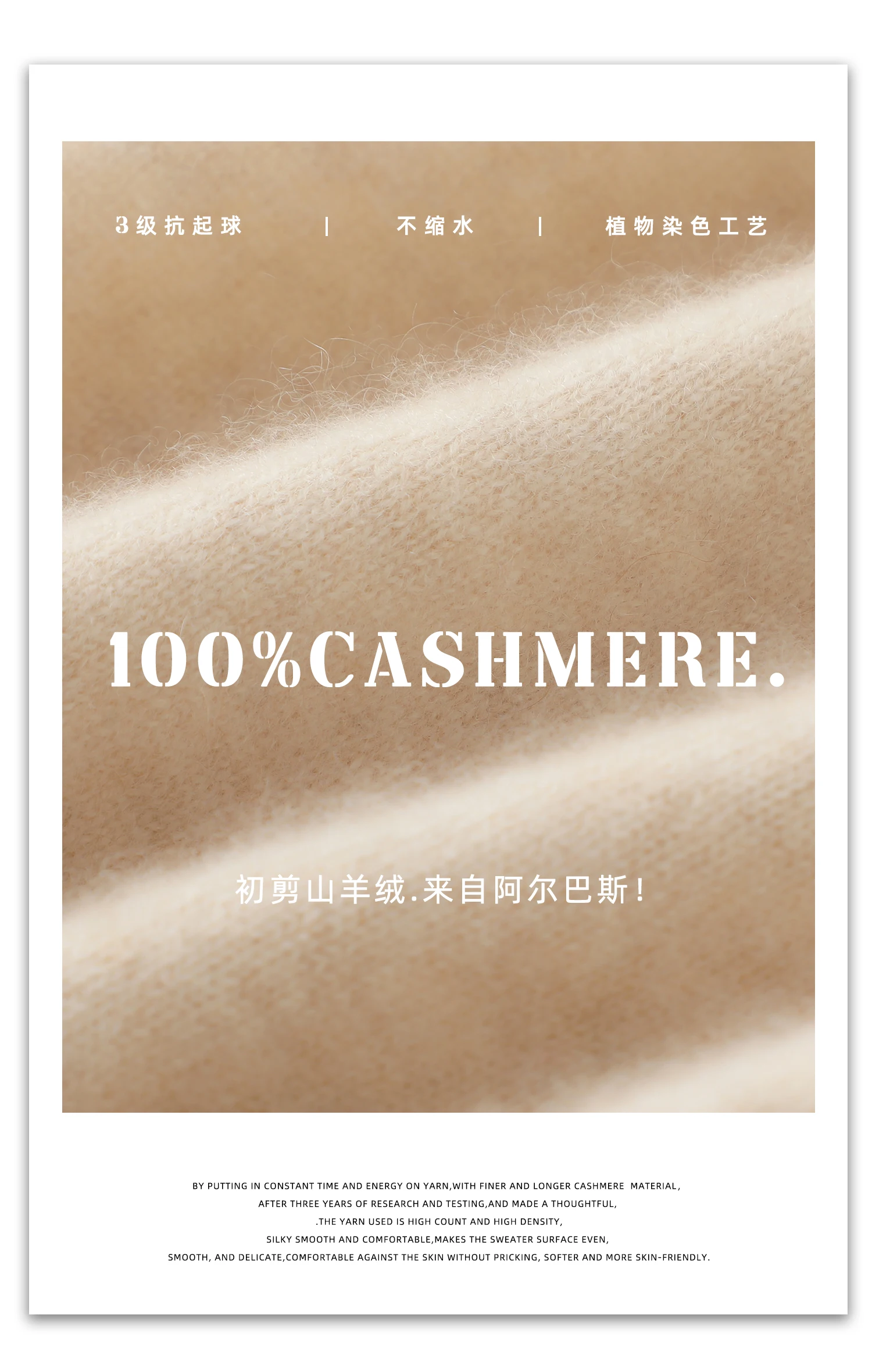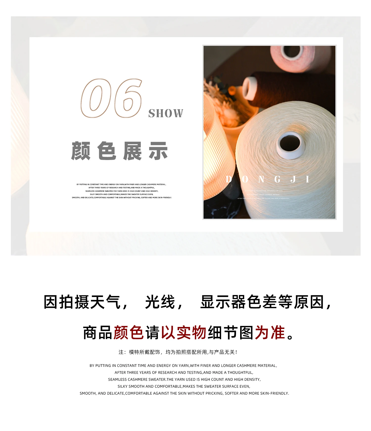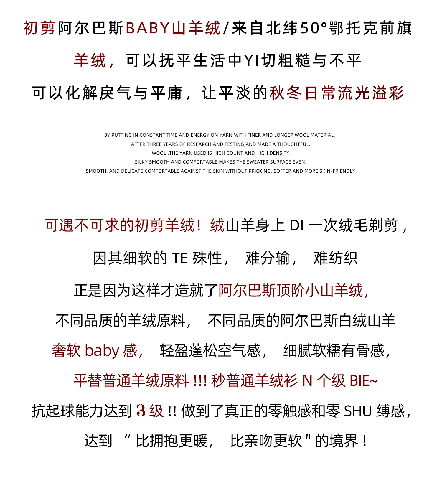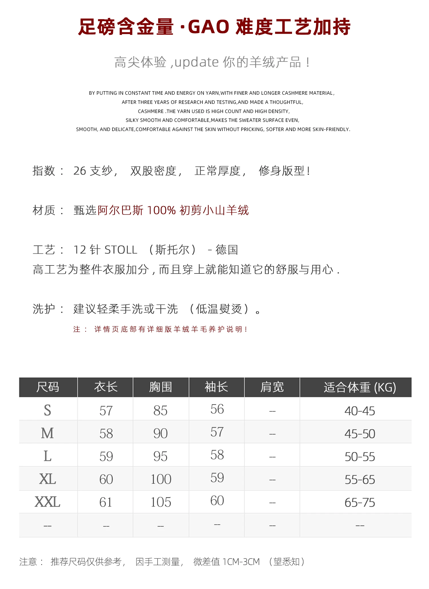 *This 100% cashmere sweater is made of 38Nm/2 pure cashmere yarn, with a cashmere fineness of 14.9 microns and a soft and fluffy texture. It is made of double layer dense knit yarn made of Long Staple's finest fibers, which has the best anti pilling performance.