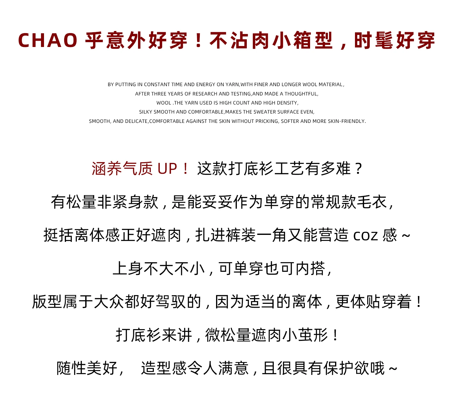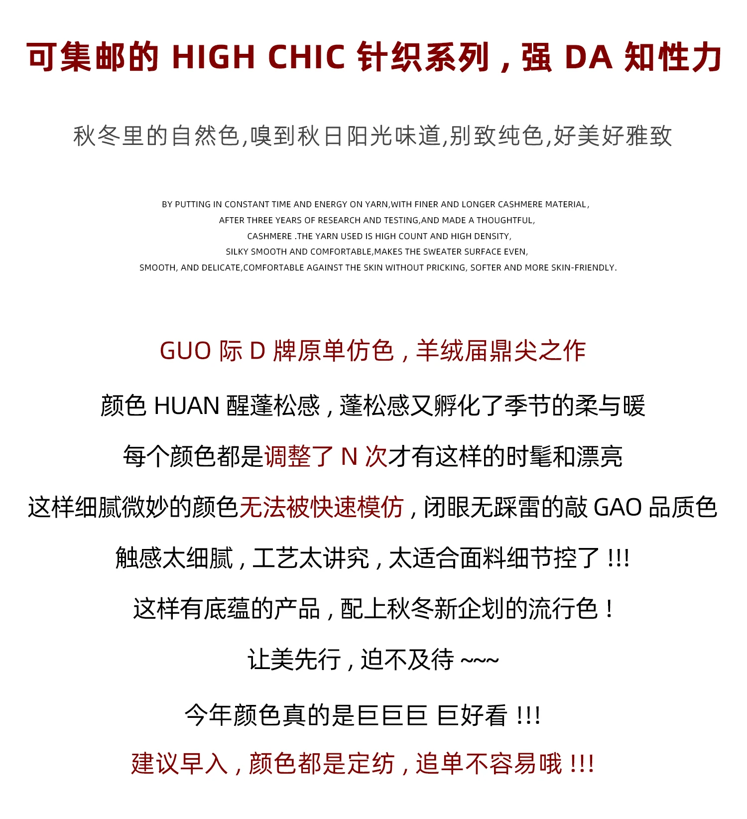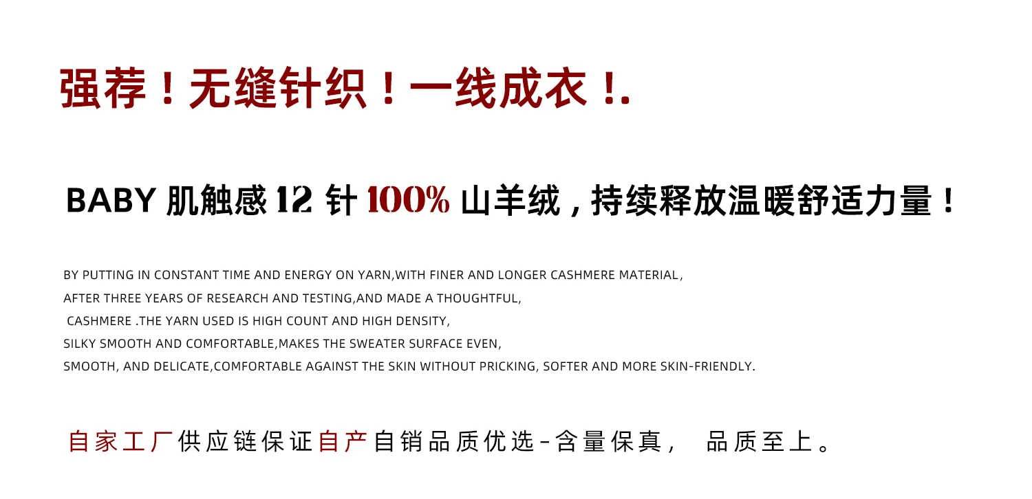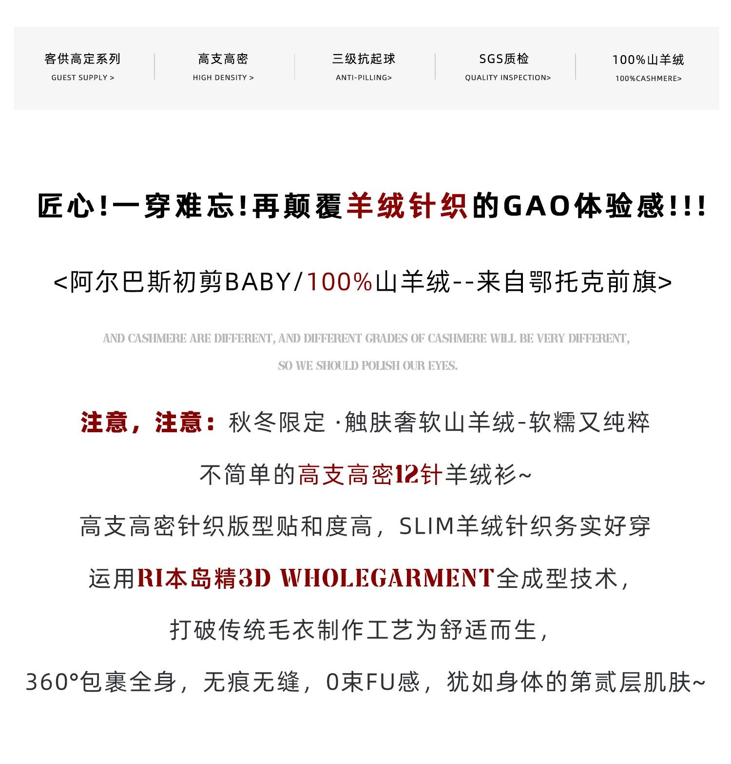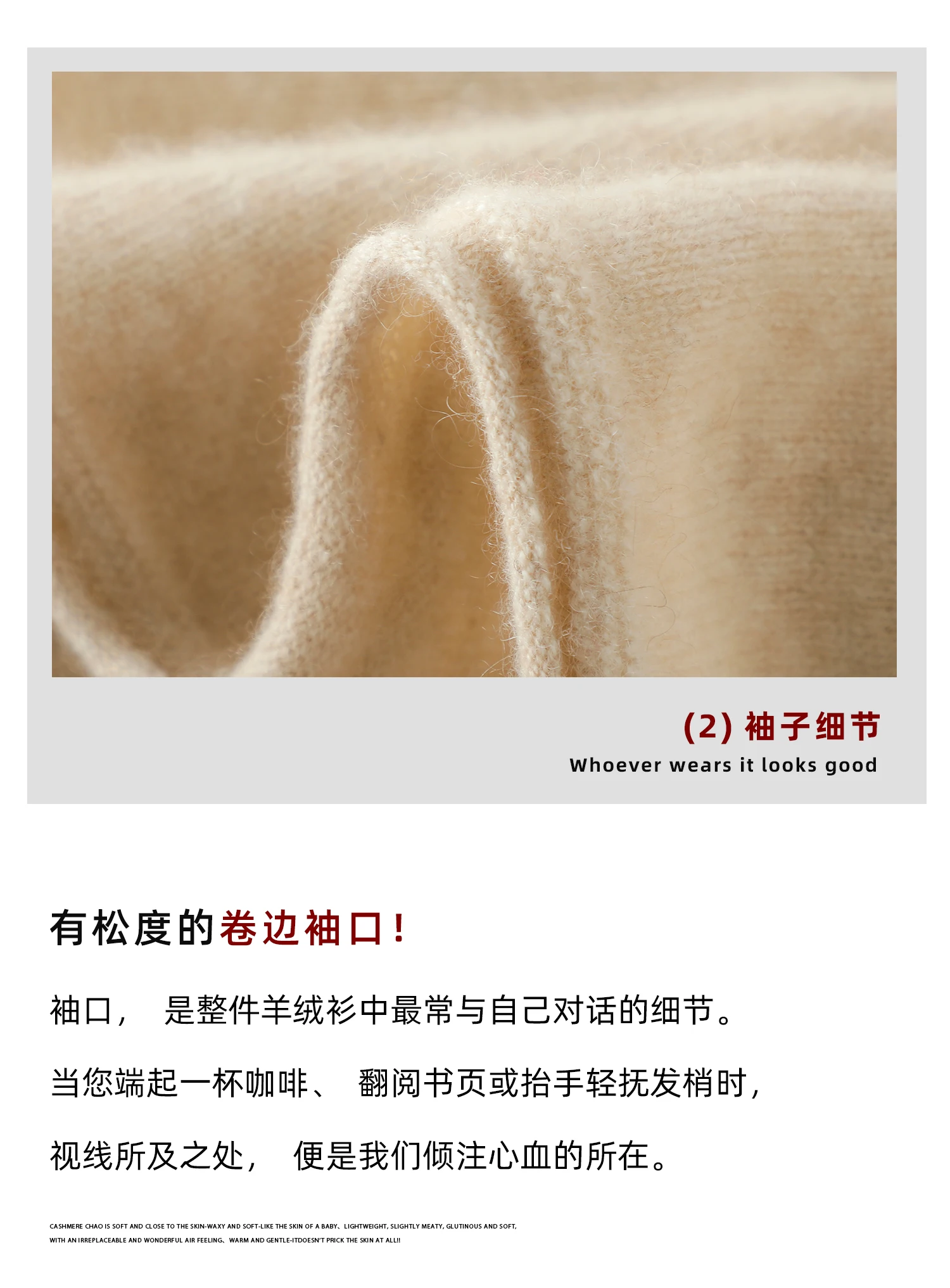 *This 100% cashmere sweater is made of 38Nm/2 pure cashmere yarn, with a cashmere fineness of 14.9 microns and a soft and fluffy texture. It is made of double layer dense knit yarn made of Long Staple's finest fibers, which has the best anti pilling performance.